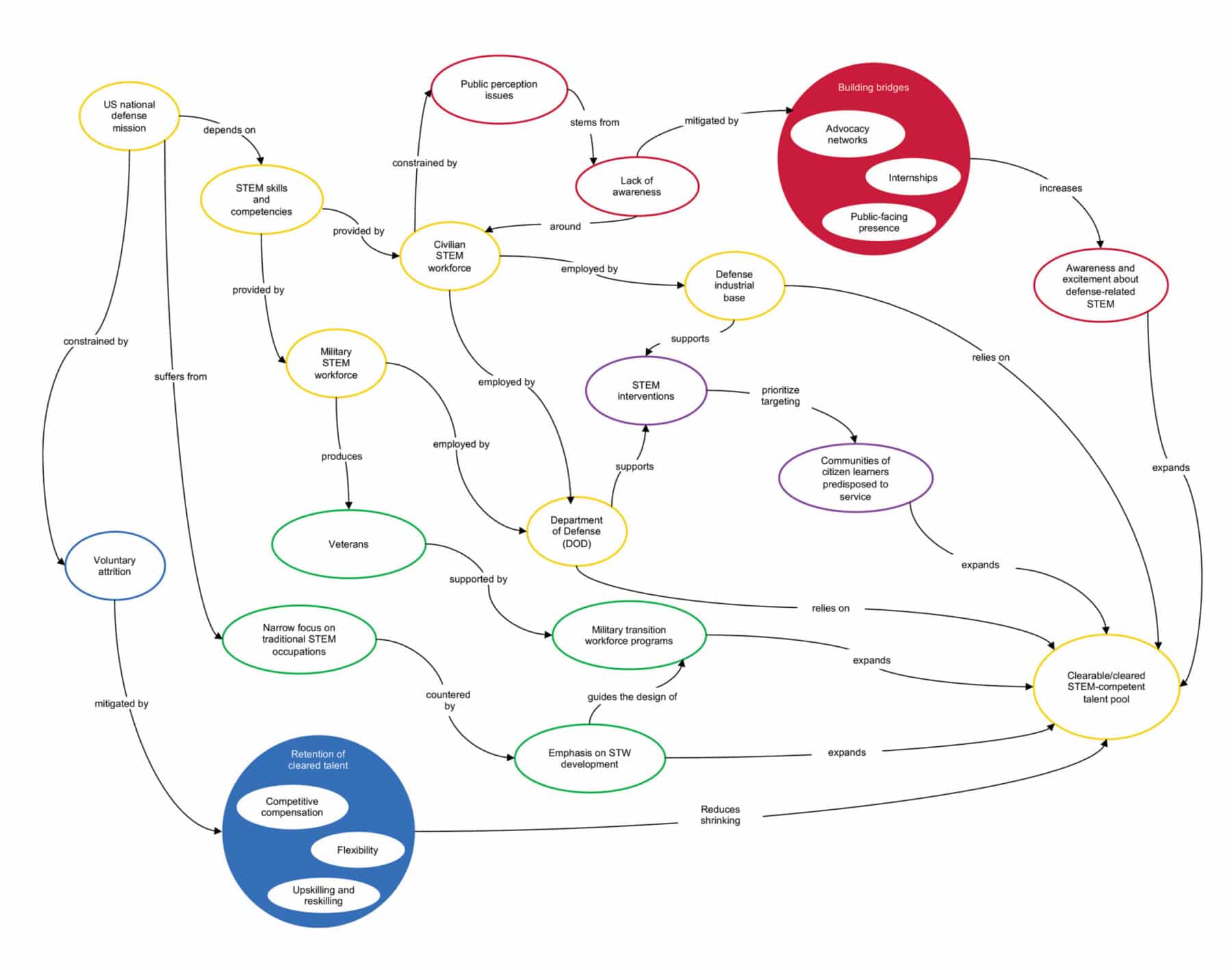 To welcome more of the American population into the sector, the defense sector must better align resources for STEM education and training to accommodate more diverse routes into the STEM workforce. We developed a systemigram—a systems-level visual narrative that maps interdependent relationships, opportunities for alignment, and leverage points that shape this space—to better understand the fragmented and complex landscape of national security STEM talent development. Rather than mapping every program, the systemigram distills the most critical insights from our research into a focused and actionable representation of the broader ecosystem.