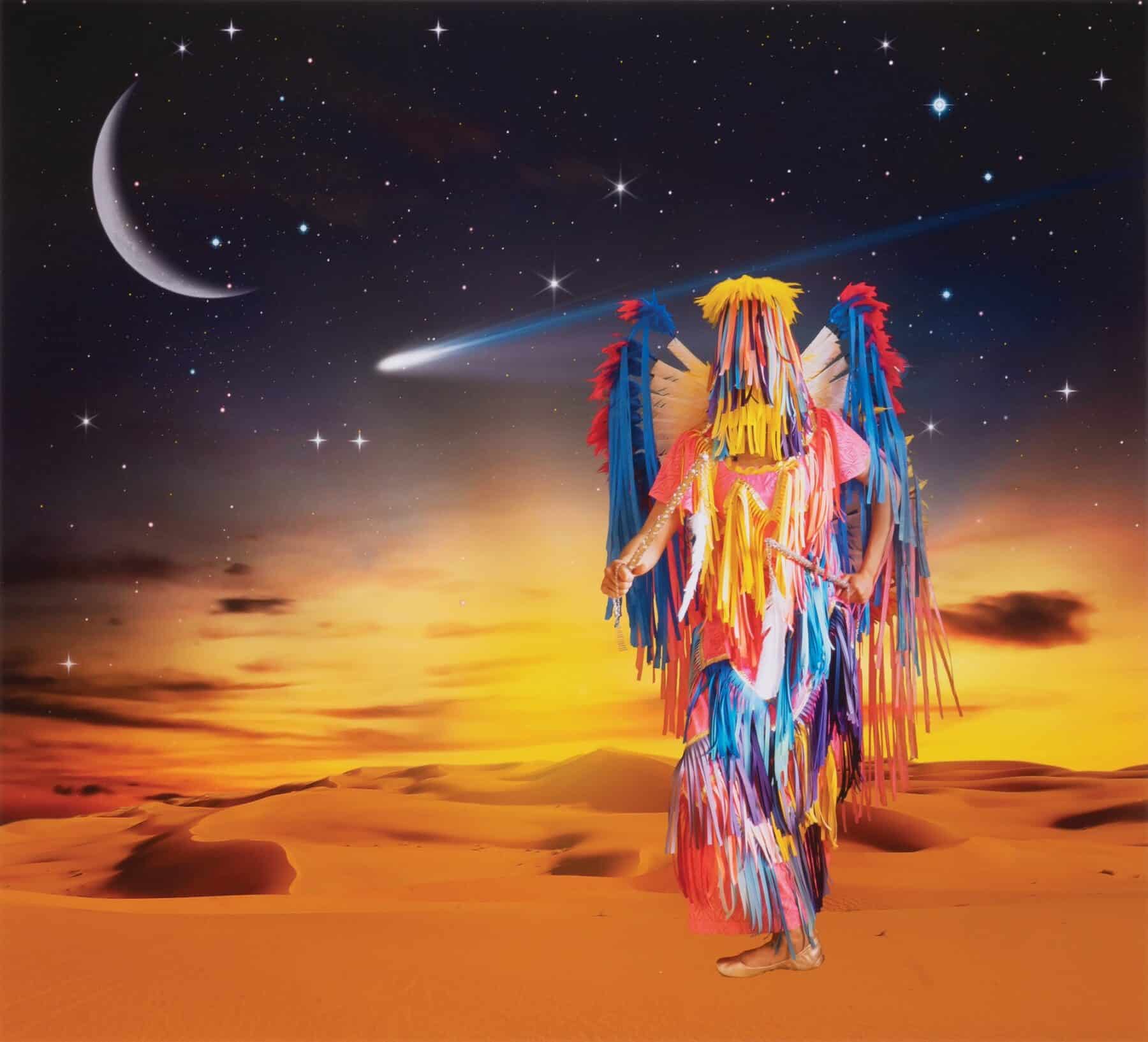 Featuring over 50 artworks, Future Imaginaries creates unexpected and thought-provoking encounters between contemporary Indigenous creations and other works at the Autry. Wendy Red Star transports Indigenous figures adorned in fantastical regalia into surreal, cosmic landscapes. Cara Romero’s photography illuminates the modernity of Native peoples, blending Indigenous perspectives with supernatural elements in everyday life. Jontay Kahmakoatayo (also known as Jontay Kahm) merges unconventional materials—Styrofoam, pebbles, and mesh—with shimmering organza twill fabric, designing futuristic fashion inspired by fossils.