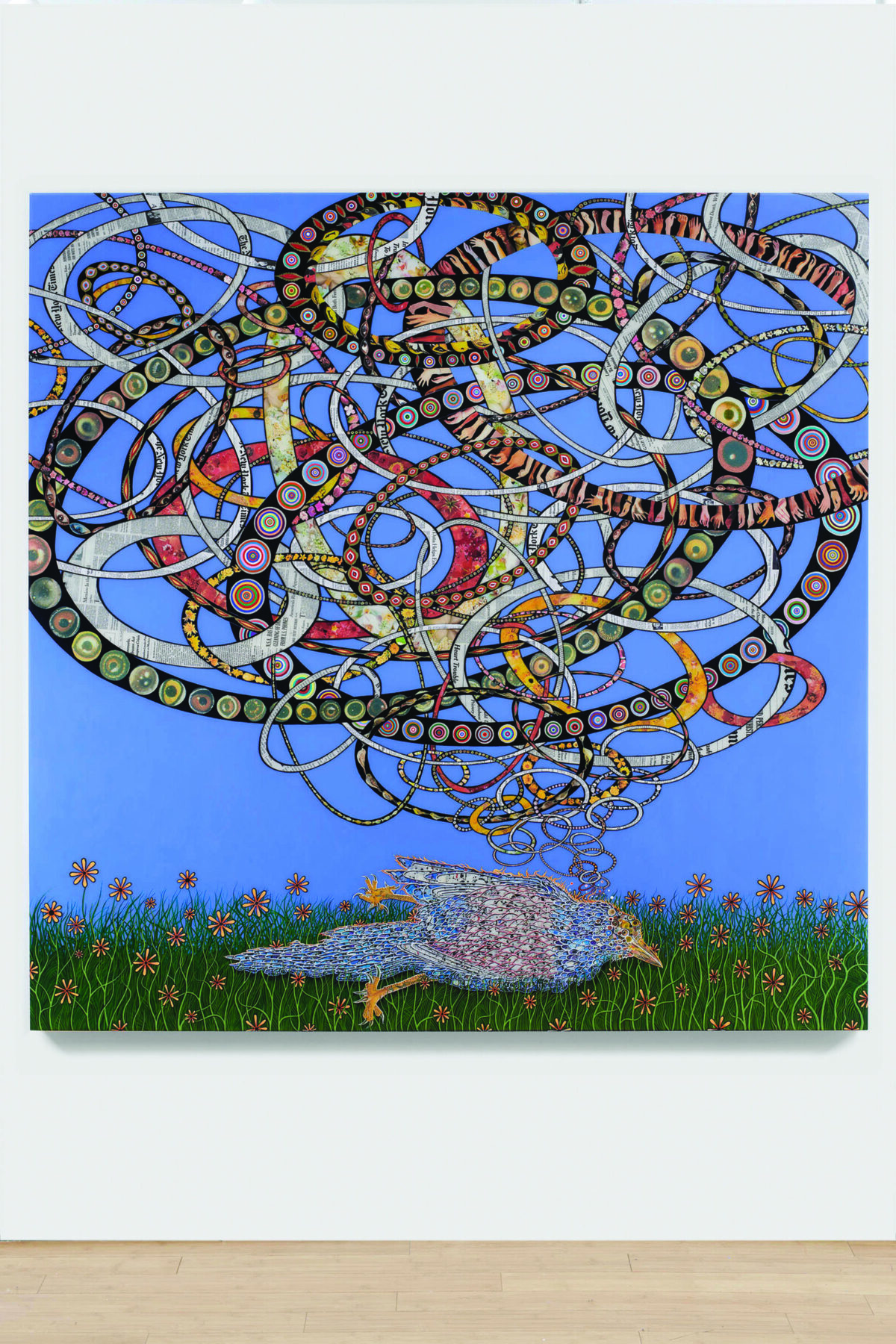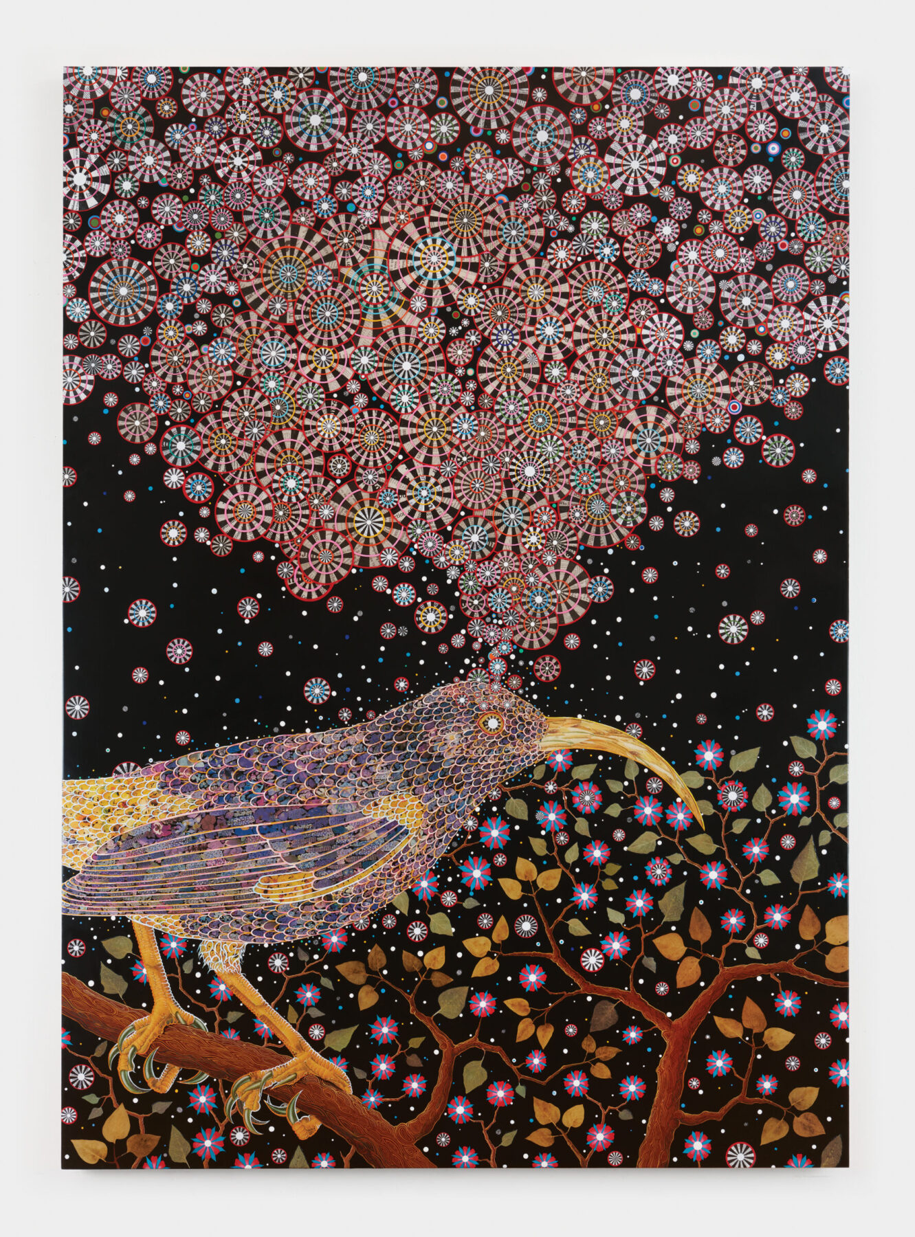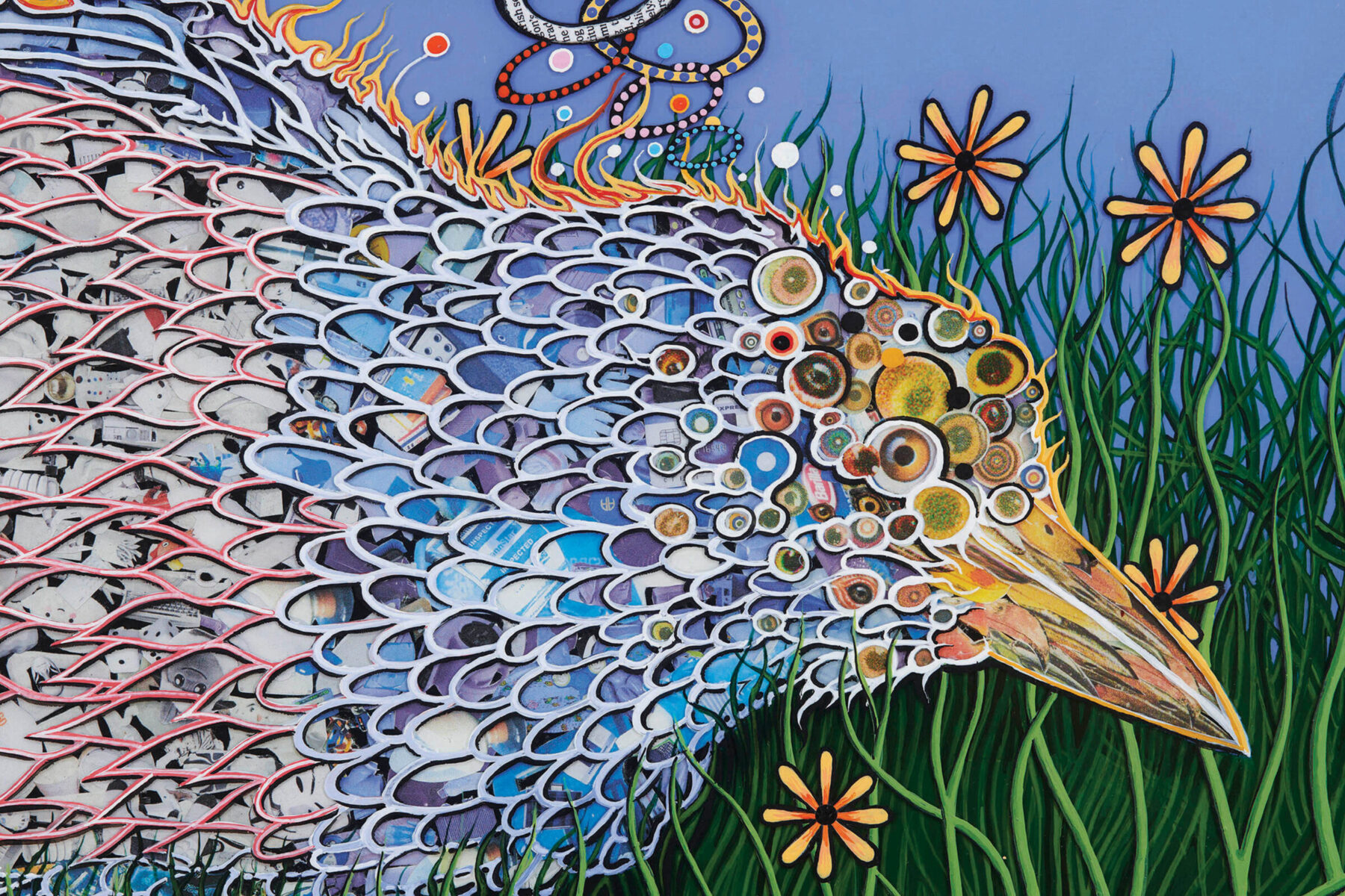 Fred Tomaselli’s work exists in a space of generative tension between visual extravagance, cultural observation, and altered perception. Through his process, he creates work that functions as both window and mirror, navigating the friction between inner experience and external reality.