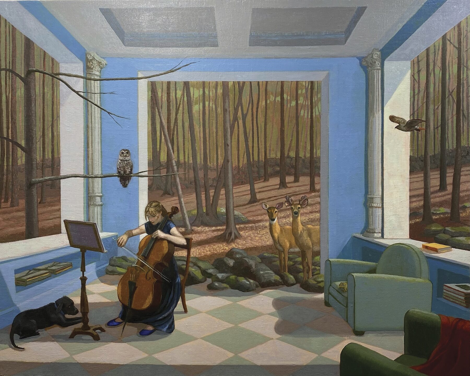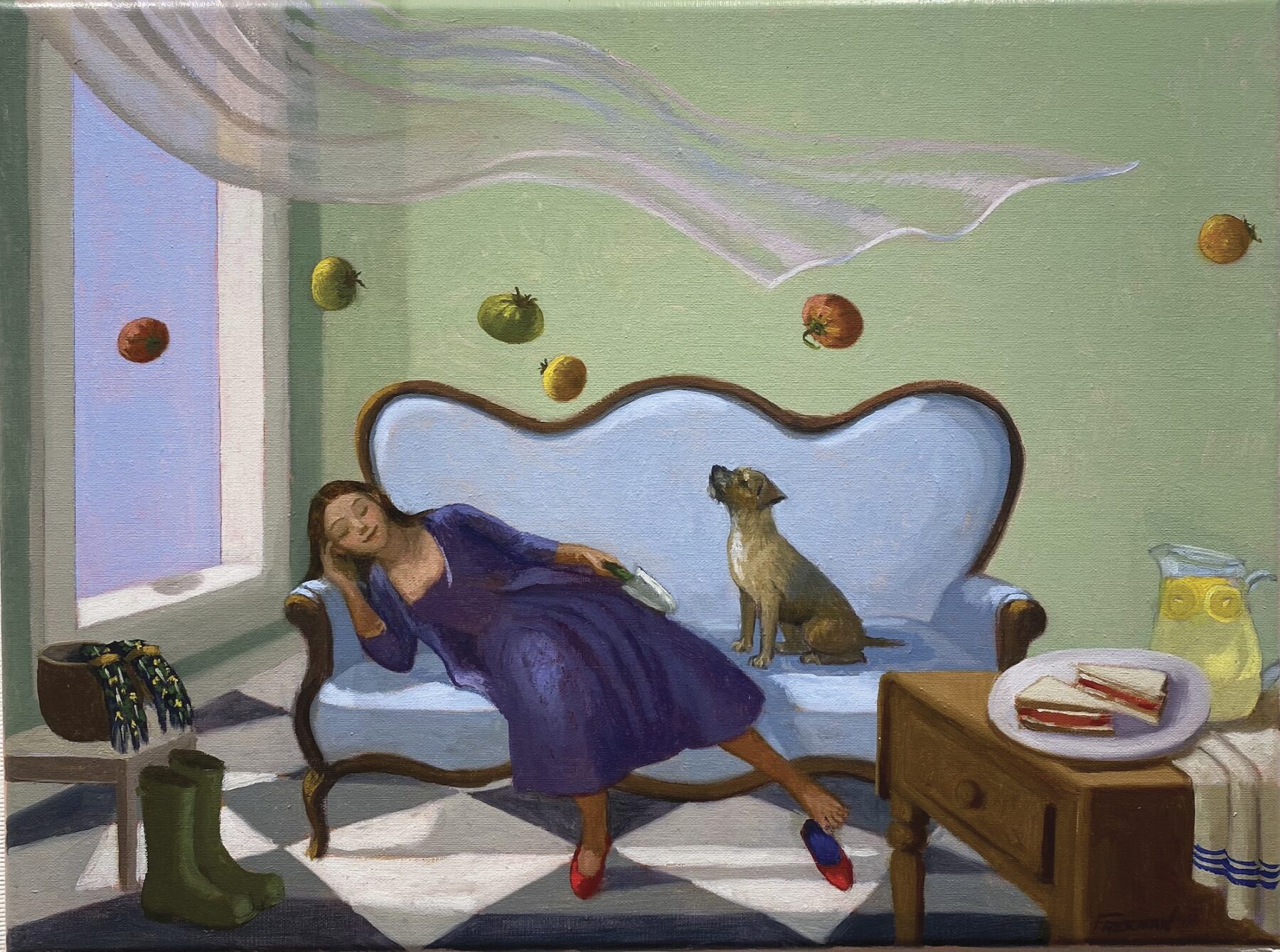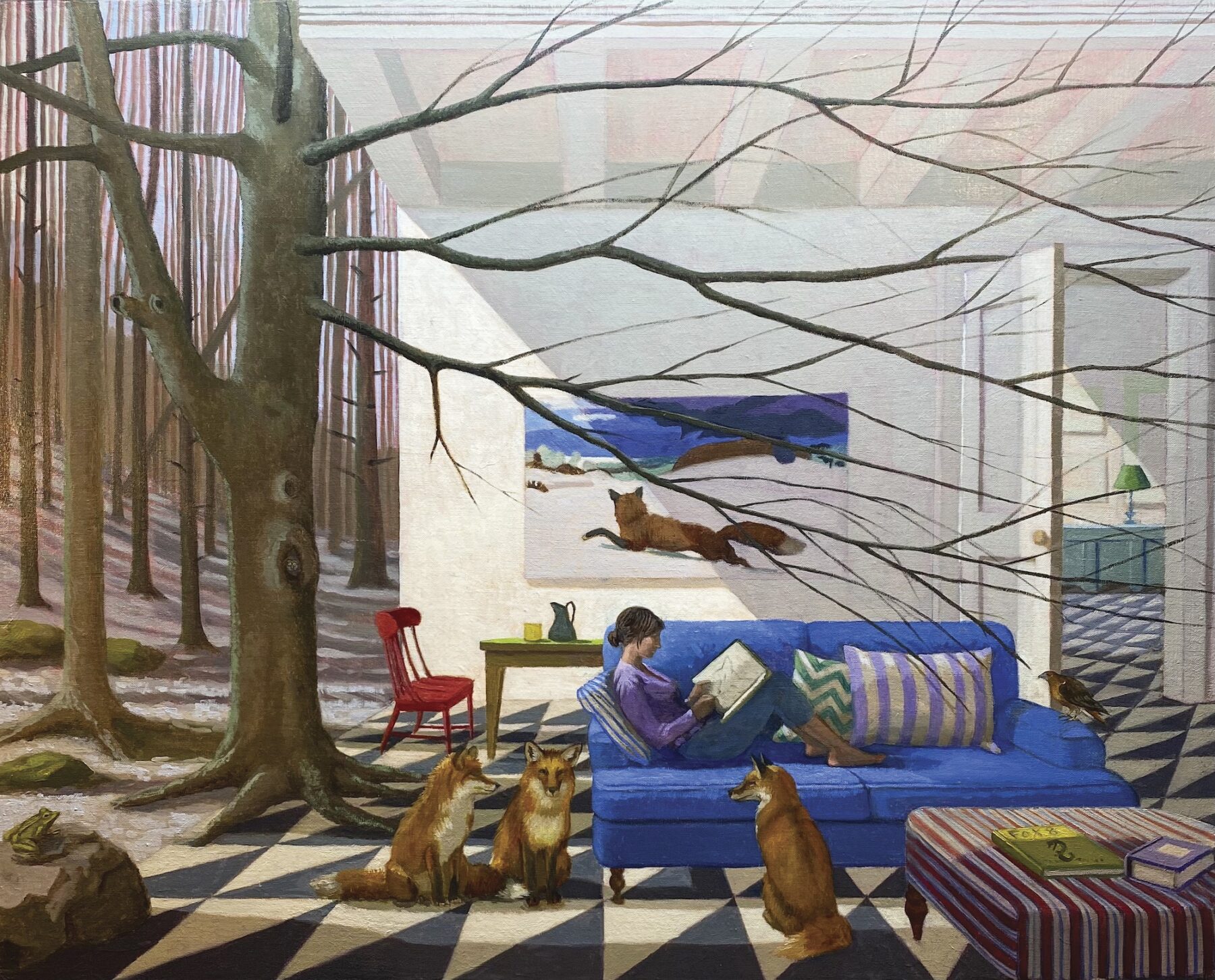 “I always drew what I dreamed,” Freeman notes. As in the experience of a dream, where one can take the absurd in stride, the humans of Freeman’s paintings maintain a nonchalant disposition in the face of extraordinary occurrences. This notion is furthered by her use of setting, as the architecture of the living rooms, kitchens, and bedrooms encourages reciprocity between humans and the natural world. In some places, exterior walls are missing entirely, allowing interior space to flow seamlessly into landscapes of verdant forests and humble mountains that are inspired by the artist’s surroundings in the Berkshires.