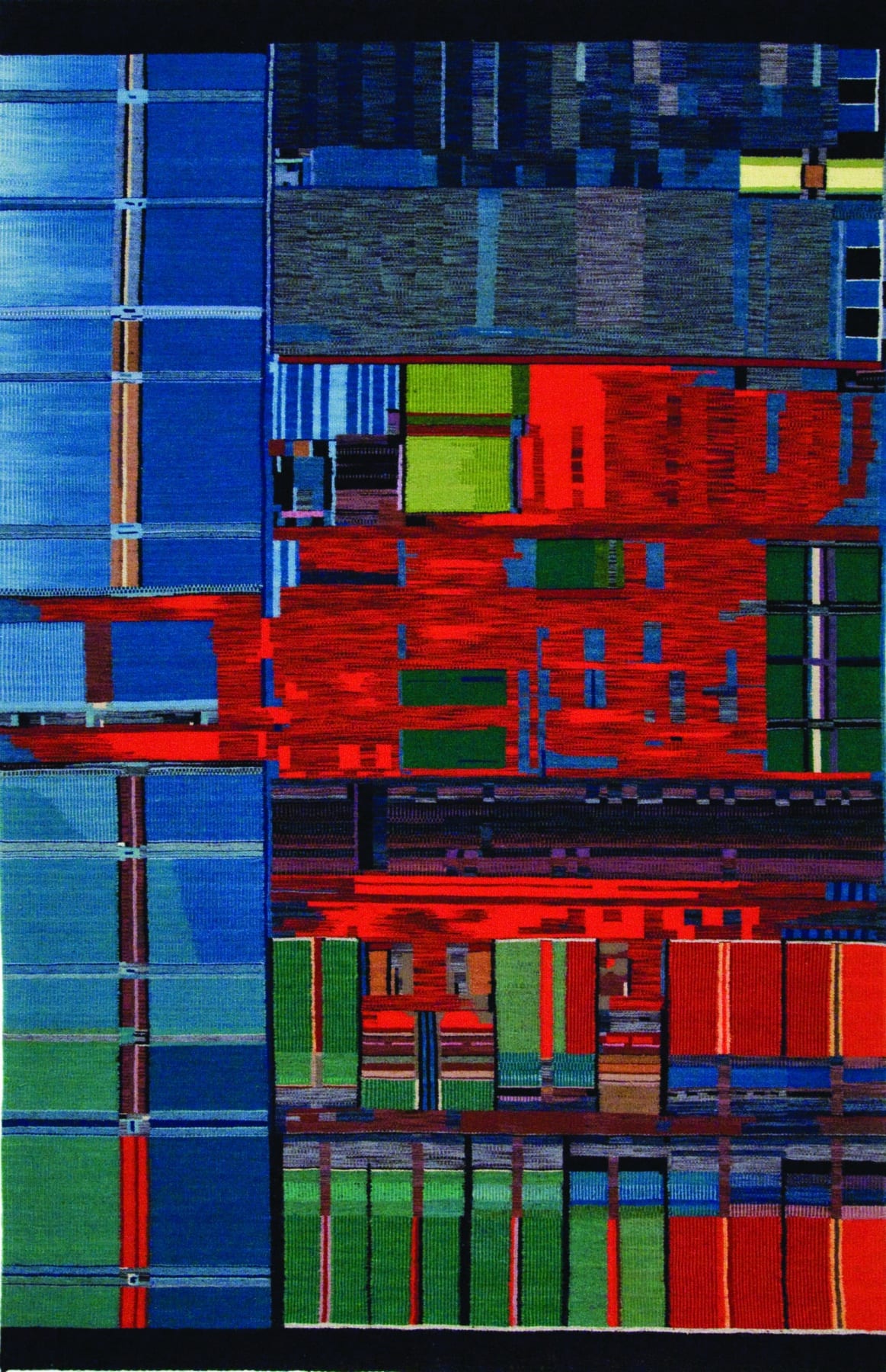 A pivotal moment in Schultz’s artistic career came in 1993 with a commission from Intel. As part of their “Weaving and Technology” conference, she was asked to weave a design based on a Pentium microchip to be presented as a gift to the American Indian Science and Engineering Society. The resulting piece, Replica of a Chip (1994), required her to grapple with complex challenges, including translating the abstract circuitry and fine detail of a microchip into woven form using natural dyes, shade gradations, and novel weaving techniques. Reflecting on the task, she recalled thinking, “What did I agree to? This is impossible!” To approach the complexity, she divided the reference image into a grid using her mathematics background, breaking it down proportionally into 64ths. Employing a raised‑outline method and alternating between two colors, she adapted her mother’s diagonal designs into vertical ones, demonstrating both technical ingenuity and artistic courage.