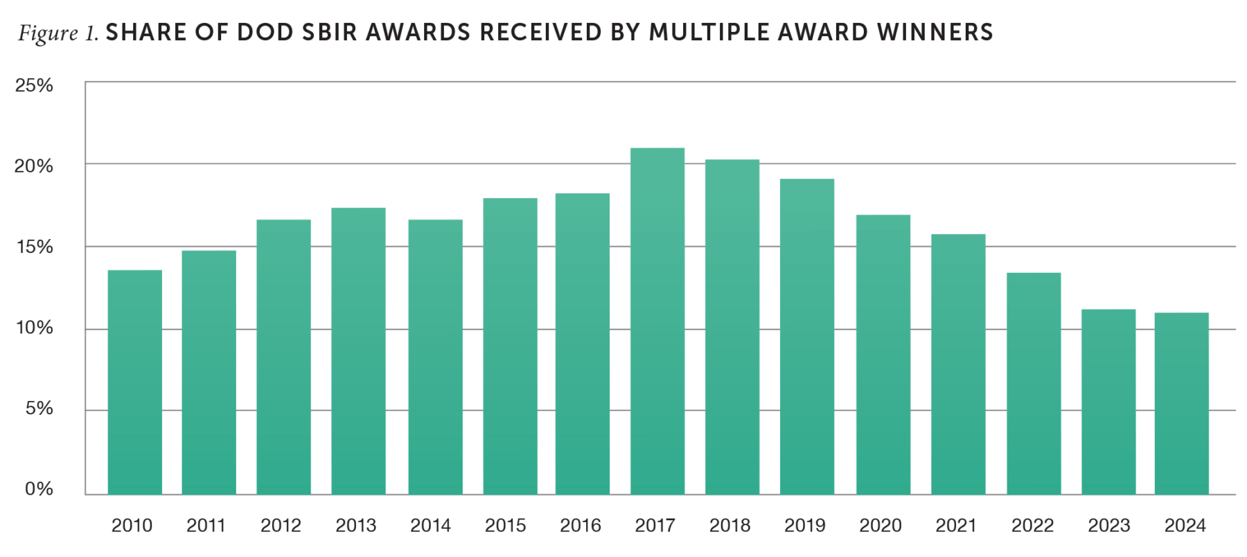 Viasat officially graduated from SBIR eligibility when an acquisition grew its staff to more than 750 employees—no longer small by program standards. But not all SBIR-dependent startups become established defense contractors; some stay dependent. Companies that participate in the SBIR program for multiple years (sometimes decades) but derive minimal revenue from commercial or non-SBIR government sources are considered mills, or “multiple award winners.” For multiple award winners participating in the DOD program between FY2010 and FY2025, SBIR awards constituted 56% of revenues on average. When companies receive more revenue from SBIR grants than from contracts for their technology over decades, that is a signal that the program may not be seeding growth as intended.