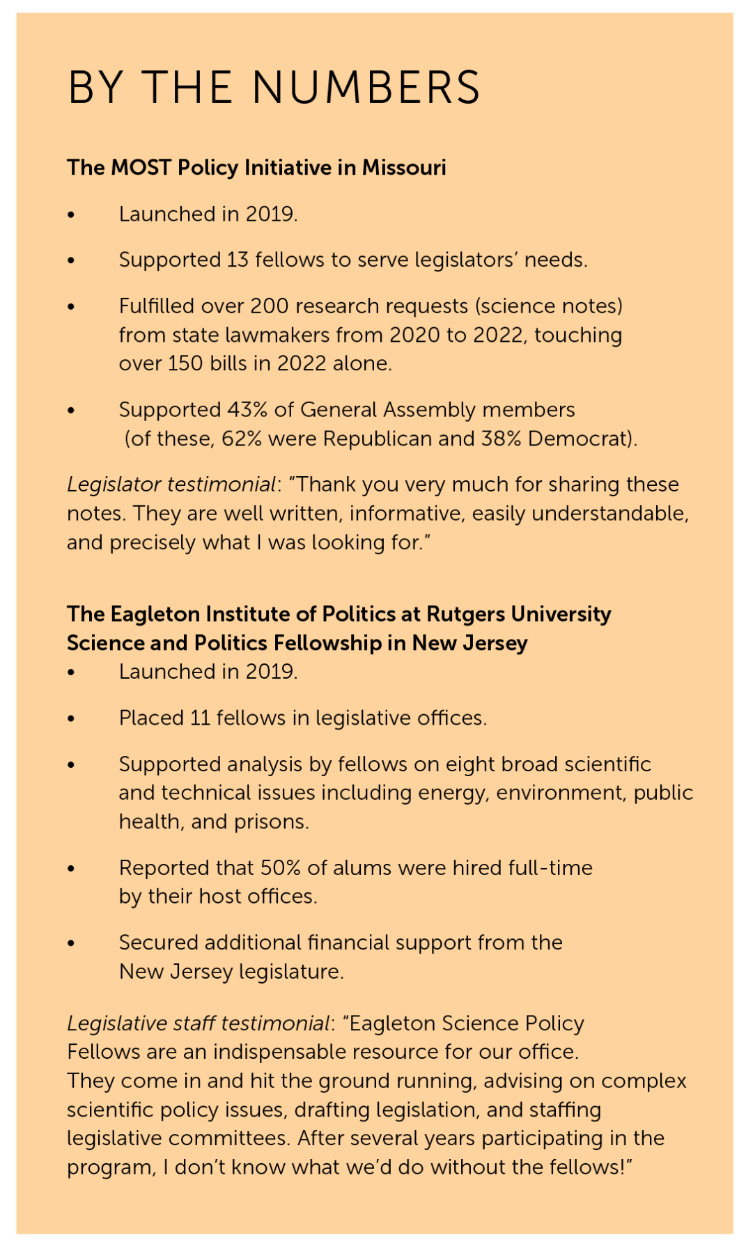 Over the past 15 years, with support from the Gordon and Betty Moore Foundation and others, legislatures as different as those in California, Connecticut, Idaho, Missouri, New Jersey, New York, and West Virginia have embraced science policy fellows as a way to provide access to scientific expertise. Each fellowship is uniquely structured to meet the needs, preferences, and procedures of its state legislature. For example, fellows may synthesize technical information, analyze bills, organize hearings, or draft publicly available memos to help decisionmakers better understand the available scientific evidence. Memos written for the Missouri and West Virginia legislatures take the form of science and technology notes—briefs on topics requested by state senators and representatives. Whether working directly with legislators, on committees alongside other staff and aides, or in legislative services offices that are accessible to entire chambers, science fellows add valuable capacity to existing legislative staffs and research offices—and often become trusted members of legislative teams. In all cases, legislators gain immediate access to science advisors who can help them prepare for policy discussions and craft or navigate pending legislation.